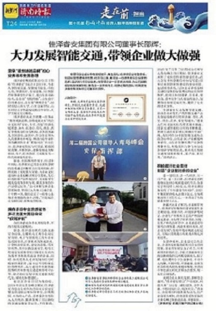 2021年7月,佳澤睿安董事長邵輝帶領(lǐng)企業(yè)參與第二屆跨國公司領(lǐng)導人青島峰會安保指揮部項目建設(shè),為“第二屆跨國公司領(lǐng)導人青島峰會”的召開提供安保服務(wù),包括指揮部建設(shè)項目、包括LED大屏視頻會議及通信設(shè)備的安裝調(diào)試和運行保障維護。